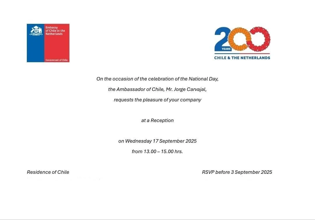 17 sept 2025 brachten we een bezoek in het Residentiële huis van Chili gingen we oa ook in gesprek met de Chileense Ambassadeur dhr.Jorge Carvajal En vierde we onafhankelijkheidsdag alvast dat is vandaag 18 sept. Zie afbeelding